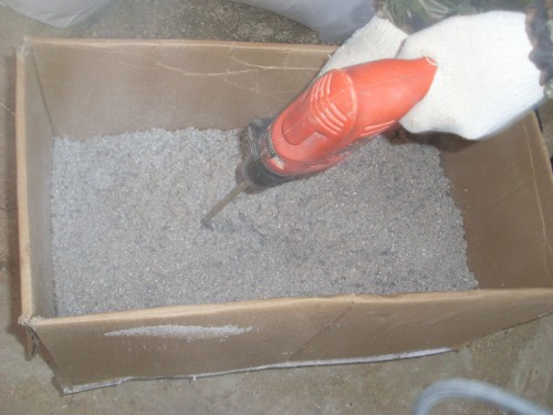 - В емкости, например, пластмассовом корыте, строительным миксером взбивается эковата. Насыпать ее нужно примерно до половины емкости и взбивать, пока корыто не заполнится.
