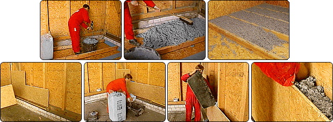 На утепляемую стену устанавливаются вертикальные стойки на расстоянии 40-60см друг от друга. Толщина стойки подразумевает толщину слоя утеплителя. (В других конструкциях эту роль играют страпила и балки перекрытий). Затем по стойкам стена закрывается вплотную доской или листовым материалом (осп). Главный критерий подготовки конструкции к утеплению является её герметичность. Через щели при монтаже будет вылетать материал, что приведёт к перерасходу. Если доску вплотную сбить не получается рекомендуется использовать под неё пароизоляцию. Из этой рекомендации вытекает третий способ зашивки (наиболее часто используемый). По стойкам сразу натягивается пароизоляционная пленка и усиливается обрешёткой из досок. Доски крепятся с разбегом в 10-20см друг от друга. В этом случае может использоваться любая доска, так как в последствии ее можно будет удалить и зашить стену отделочным материалом (вагонка, гипсокартон).