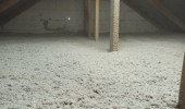 - Укладка с чердачного помещения. В этом случае гофрированный шланг опускается в наклонную полость до ветровой доски и по мере заполнения извлекается. Плотность материала при таком заполнении составляет 60-75кг/м3. Толщина слоя обуславливается толщиной страпельной ноги.