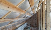 - Укладка через отверстия в кровельной пленке. Такой метод используется при утеплении скатной кровли под конёк. Отверстия проделываются в пленке на расстоянии не более 1,5 метров друг от друга и через поворотное сопло материал нагнетается в полость между страпельными ногами. Материал укладывается плотностью 60-75кг/м3. Толщина слоя обуславливается толщиной страпельной ноги.